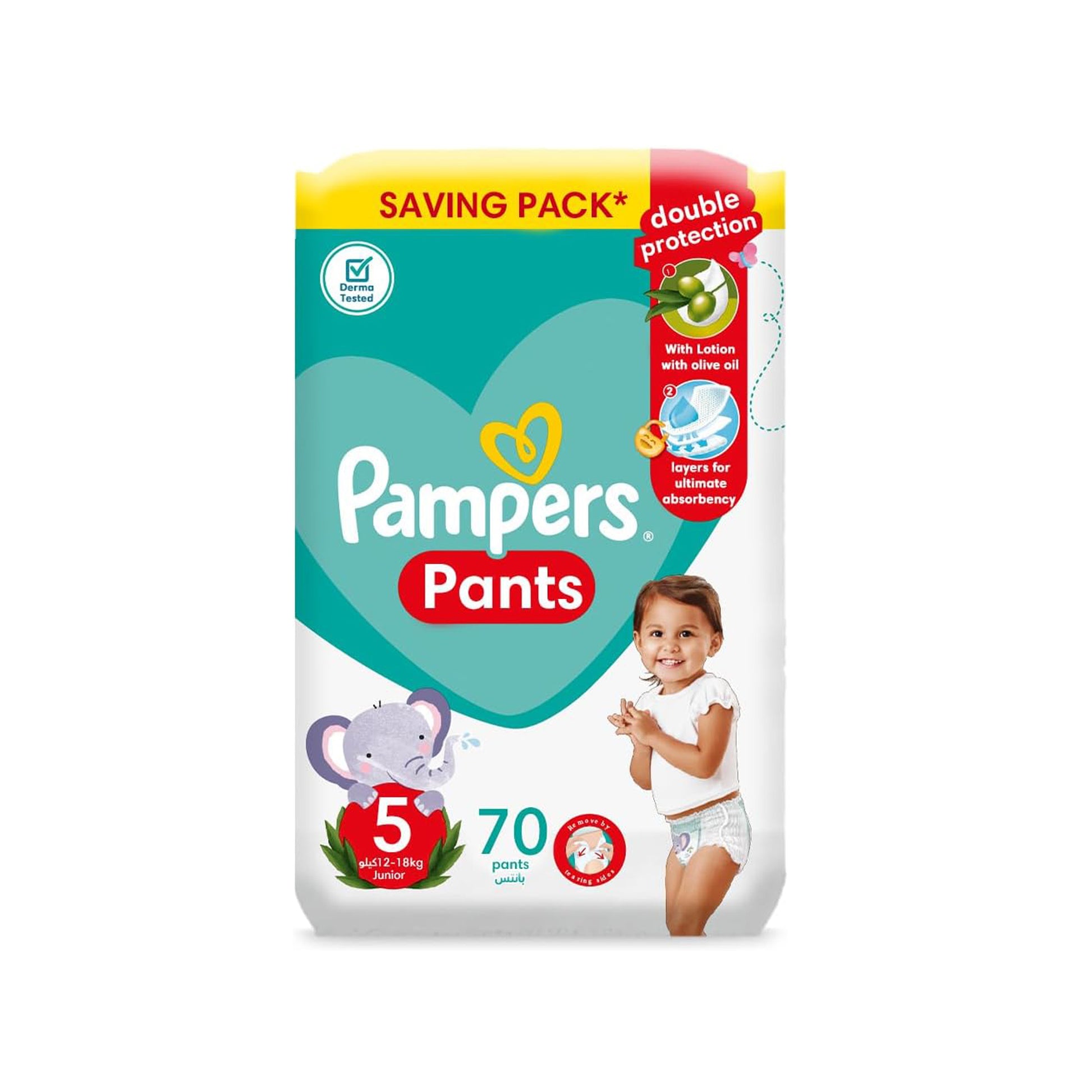 حفاضات بامبرز بيبي دراي بانتس، مقاس 5، 12-18 كجم، مع لوشن بزيت الزيتون، 70 حفاضة أطفال