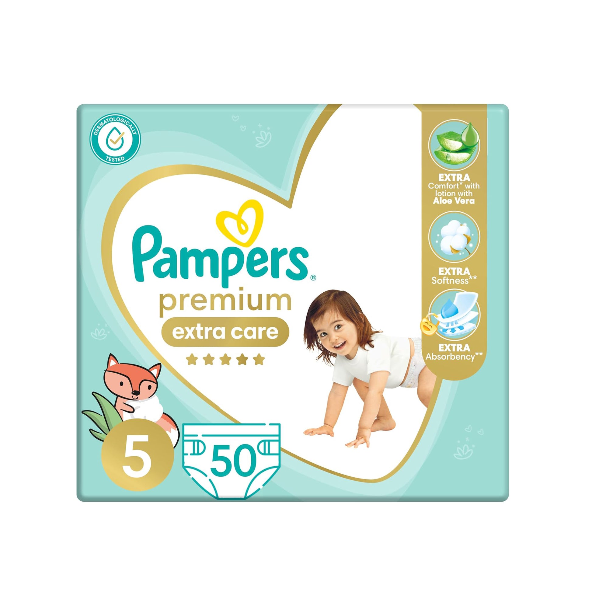 حفاضات بامبرز بريميوم إكسترا كير بشريط لاصق، مقاس 5، 11-25 كجم، مع لوشن بخلاصة الصبار، 50 حفاضة أطفال