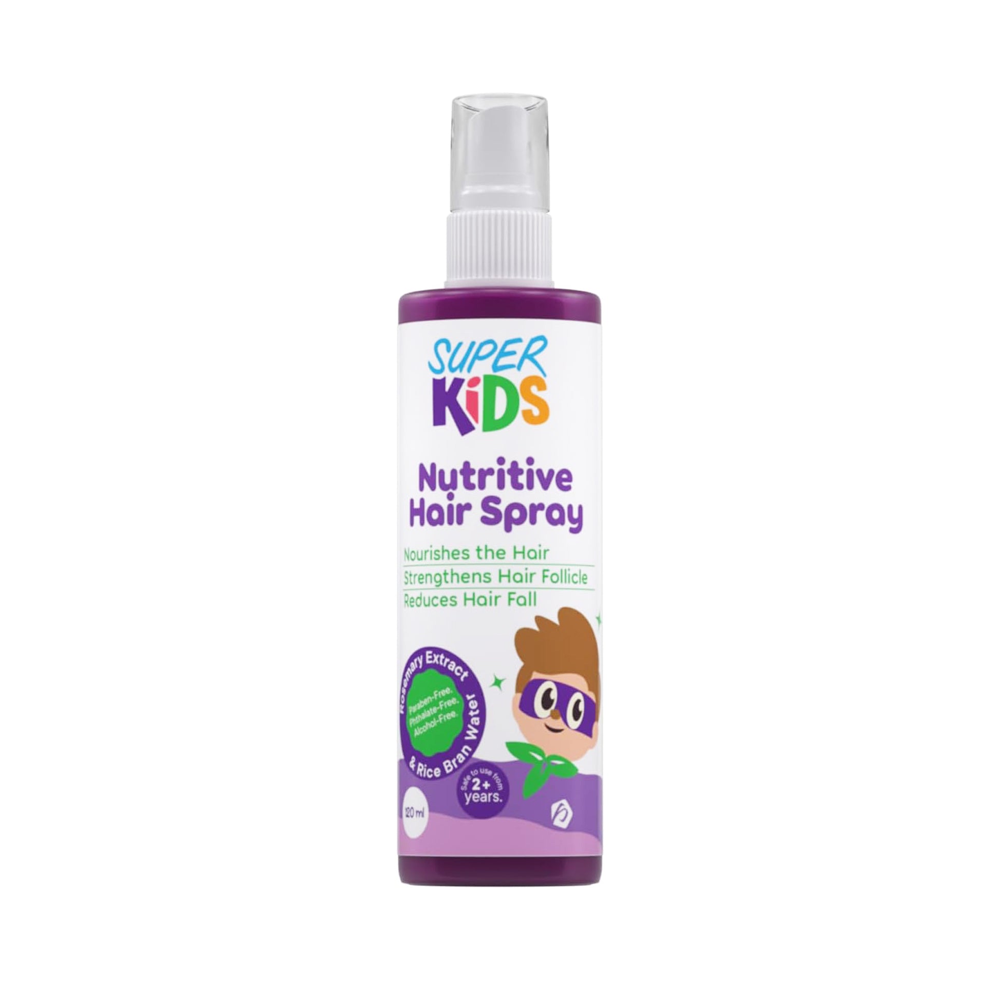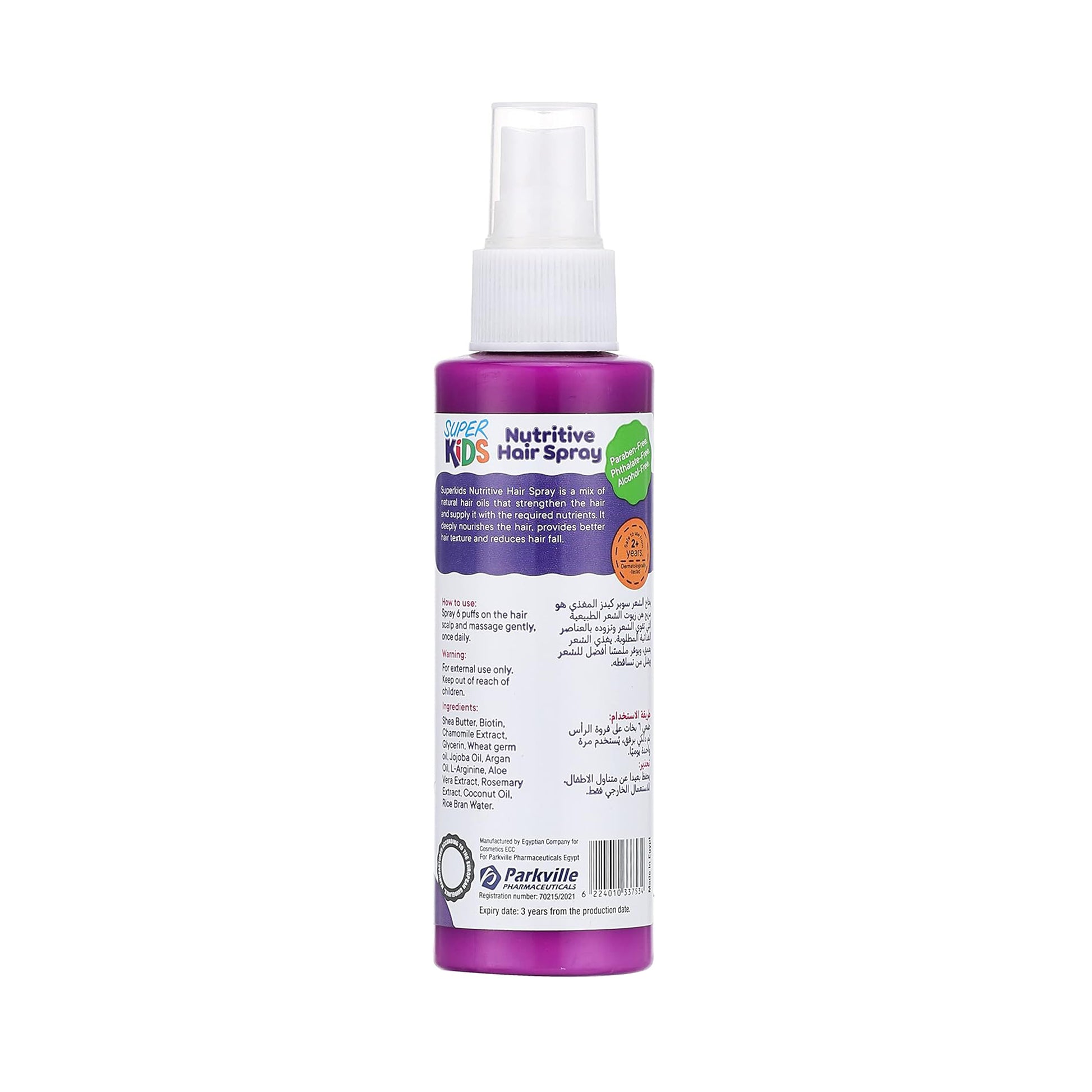 بخاخ الشعر المغذي سوبر كيدز هو مزيج من زيوت الشعر الطبيعية التي تقوي الشعر وتزوده بالعناصر الغذائية اللازمة. يغذي الشعر بعمق، ويقوي بصيلاته، ويعزز نموها، ويمنحها ملمسًا أفضل ويقلل تساقطها. آمن للاستخدام من عمر سنتين. رشي 6 بخات على فروة الرأس ودلكيها برفق مرة واحدة يوميًا.