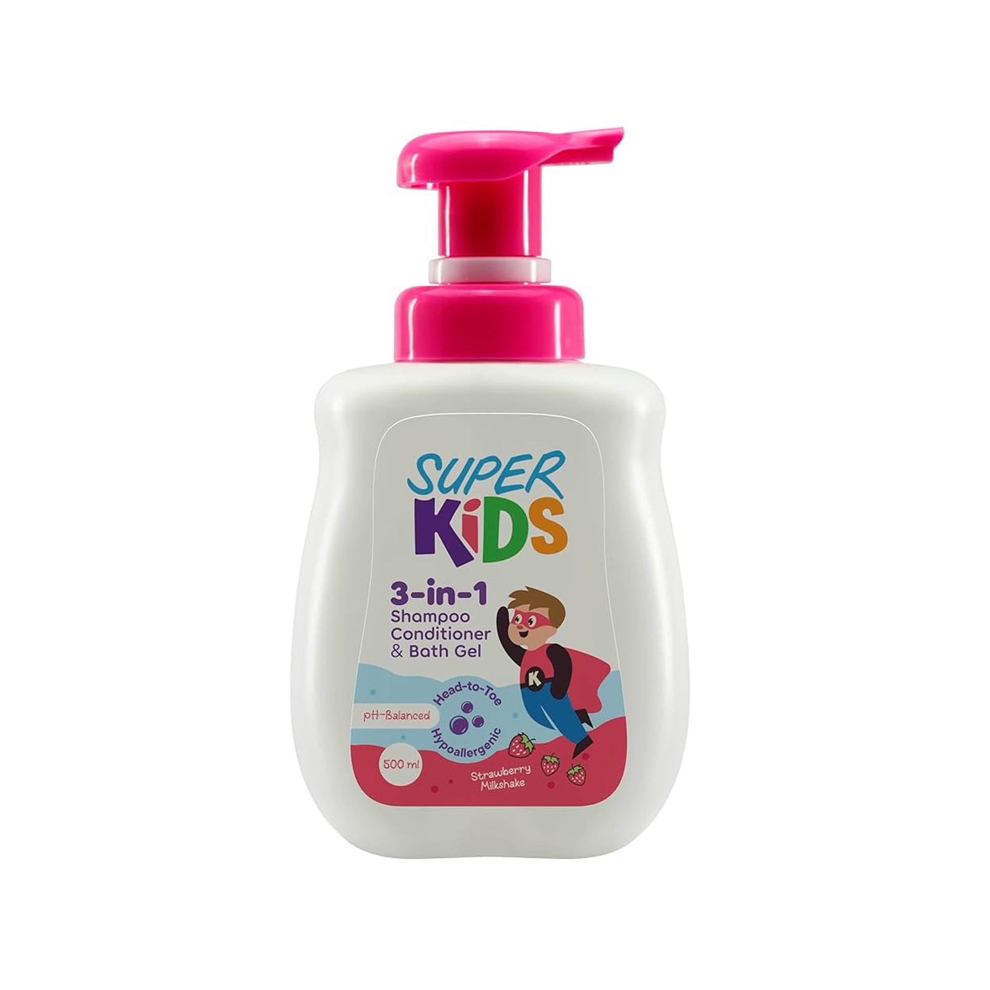 شامبو للأطفال برائحة ميلك شيك الفراولة، خالي من SLS، خالي من السيليكون، خالي من البارابين، خالي من الدموع، متوازن الحموضة.