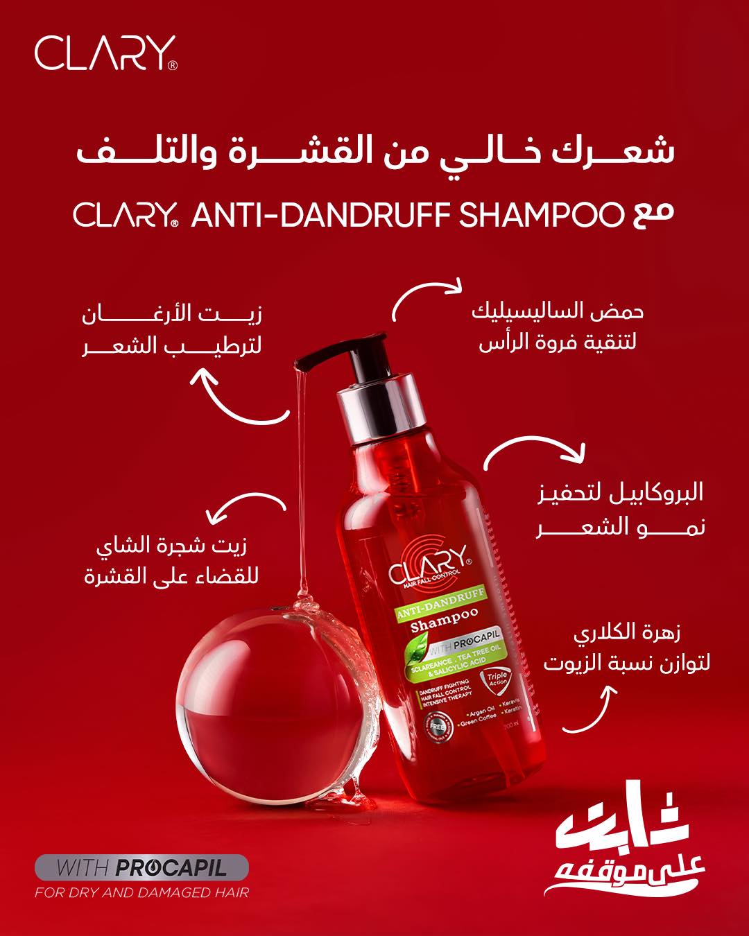 شامبو كلاري المضاد للقشرة، المُعزز بمادة "سكاليرانس"، يُنظف فروة الرأس ويقضي على القشرة. يُساعد على تهدئة حكة فروة الرأس، والسيطرة على القشرة، وتقوية بصيلات الشعر. يُساعد حمض الساليسيليك الموجود في شامبو كلاري المضاد للقشرة على فتح المسام وتنقية فروة الرأس والتخلص من الزيوت الزائدة، مما يُنتج شعرًا صحيًا وخاليًا من القشرة. يُوفر تأثيرًا مرطبًا للغاية يُنعم الشعر ويساعد على منع تلفه وتقصفه وتكسره. مُعزز بـ 3% من بروكابيل كمكون فعال رئيسي، يُقلل من تساقط الشعر عن طريق مُحاربة شيخوخة بصيلات الشعر وتنشيط بصيلات الشعر الخاملة. باختصار، يعمل شامبو كلاري المضاد للقشرة على الحفاظ على تغذية بصيلات الشعر وصحتها، مما يُساعد على منع تقصف خصلات شعرك.